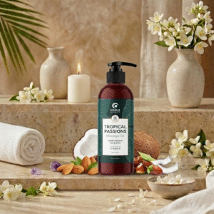 « Évadez-vous sous les tropiques avec ce mélange exotique, conçu pour éveiller vos sens et laisser votre peau délicieusement parfumée et hydratée. »